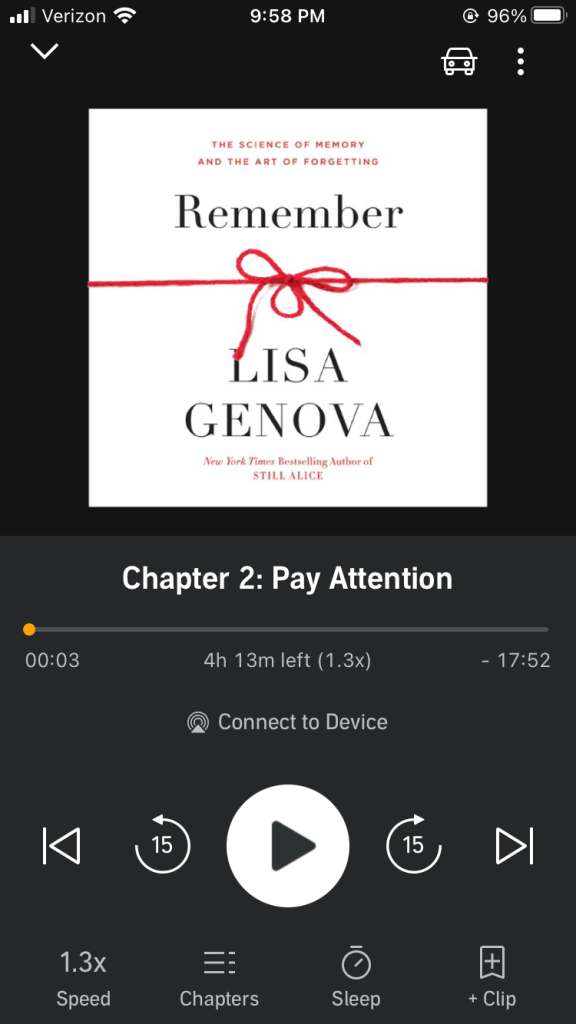 This week I started a non-fiction book titled Remember by Lisa Genova. Ms. Genova is a neuroscientist and professional speaker on the topic of Alzheimer’s disease. She has also written several fiction books in which the characters have neurological conditions. Her works include Still Alice, a book (and also a movie) about a woman with early onset Alzheimer’s disease.