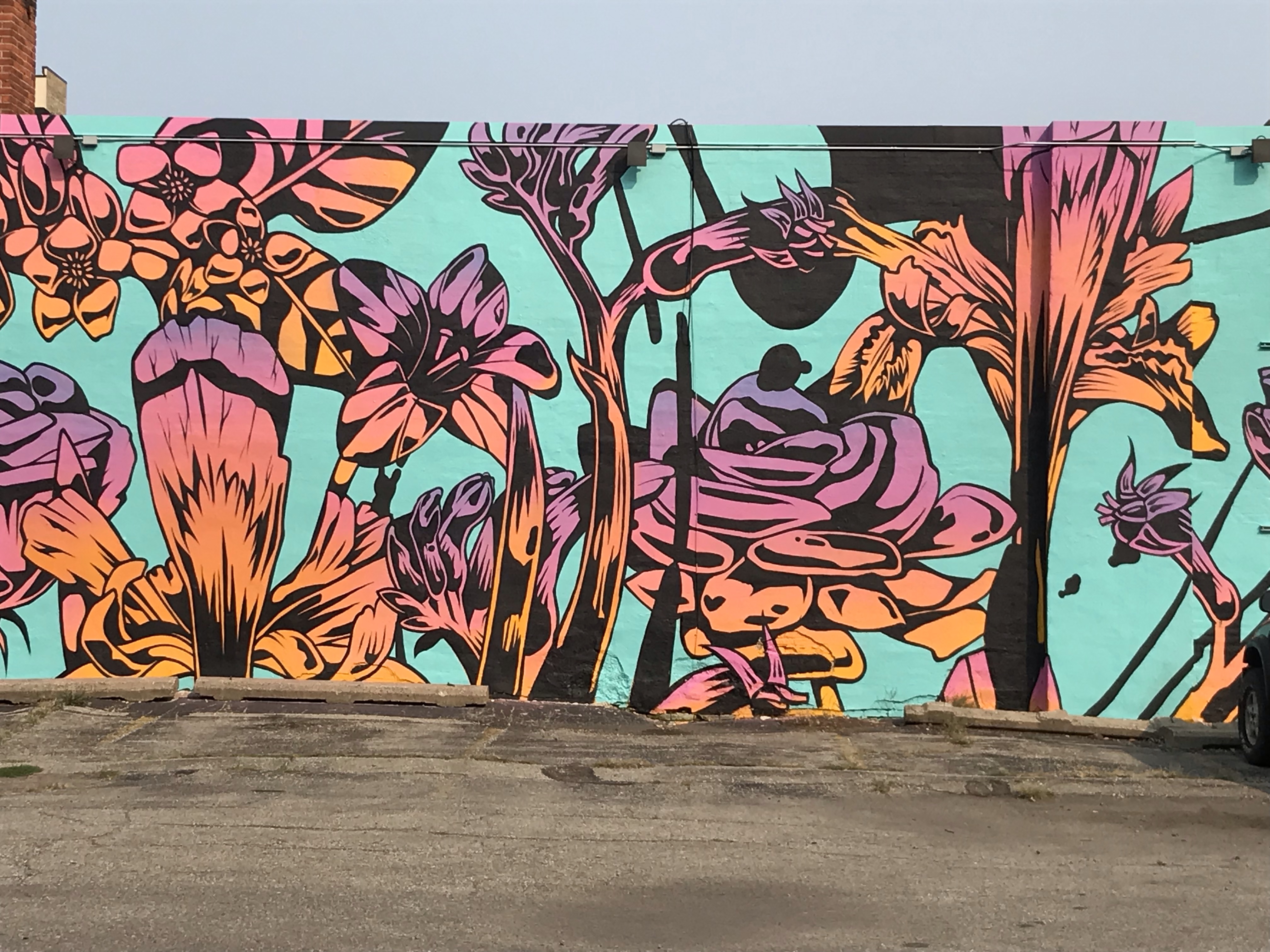 Each mural has a sign to identify the artist and where they are from. I’m always happy to see the local artist participation, but there were artists from all over the state (Kalamazoo, Flint, and our family favorite, Sault Ste. Marie) and all over the world (Brazil, Australia, and more). This one (by an artist from Greece) was absolutely stunning and people lingered a little bit longer to discuss the underlying colors and meaning of this piece of art.