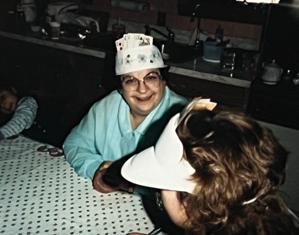 One family favorite is a game of our own devising. It’s a variation of Oh Hell! in which you don’t look at your own cards, but you get to see everyone else’s hand. After studying your opponent’s cards, you must then bid on how many tricks you think you will take. We find this uproariously funny and have improvised different headgear over the years in order to hold our cards.