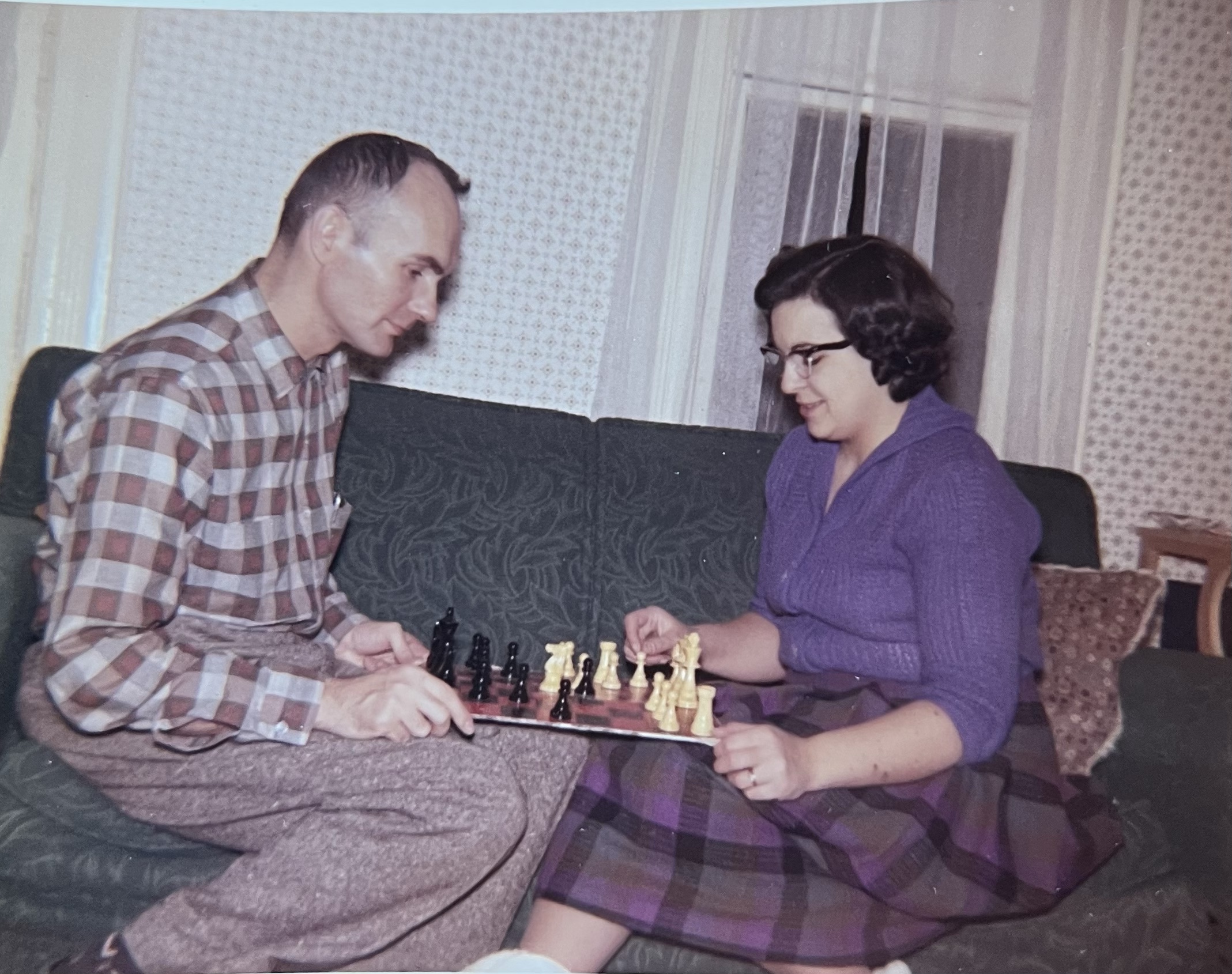 In the evenings, Mom and Dad were often involved in some type of ongoing tournament.  Games that make me think of them include Cribbage, Backgammon, and Gin Rummy.  I don’t remember seeing them play chess, but I treasure a picture taken of them before I was born, playing a game of chess with the board balanced on their knees.  After Mom was widowed, she always had Skip-bo, Rummikub, or Dominoes at the ready for when friends or grandkids visited.